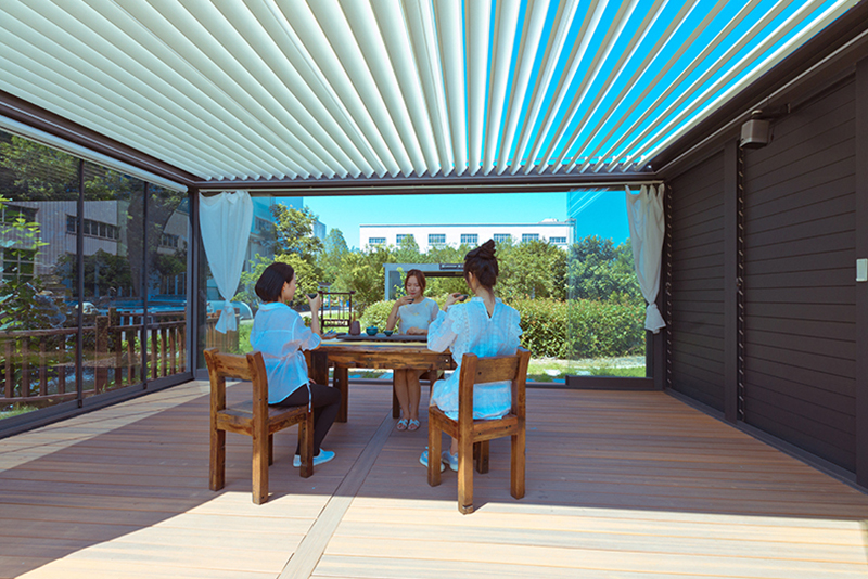 放下是房子,升起变亭子,全部打开像花架,在欧洲又叫Pergola阳光房!1、高强度铝合金结构;2、顶部铝合金叶片遥控翻转;3、四周选配推拉门、翻转百叶、可升降的防风帘及卷帘等;4、自带排水系统,选配灯光、空调、投影仪、影院、音响等。顶部可翻转,四周能升降,所以全透气、不闷热。顶部叶片闭合时防雨防晒,是不用玻璃的阳光房,大大优于易被判定为违建的固定阳光房!可用于庭院、露台、泳池、车库、大门口、天井、公共空间等处,是介于室内和室外的第三浪漫空间!