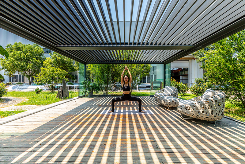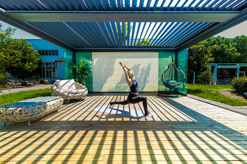 顶部可翻转,四周能升降,所以全透气、不闷热。顶部叶片闭合时防雨防晒,是不用玻璃的阳光房,大大优于易被判定为违建的固定阳光房!