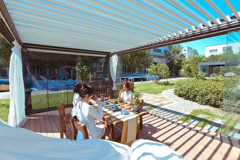 顶部可翻转,四周能升降,所以全透气、不闷热。顶部叶片闭合时防雨防晒,是不用玻璃的阳光房,大大优于易被判定为违建的固定阳光房!